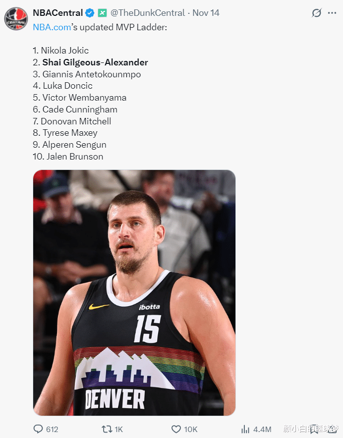 Two days ago, the NBA's official MVP list returned to first place because of Jokic's 55-point game. Now the Thunder, where SGA is located, has won another five consecutive games and ranked first in the league. SGA will definitely return to the top spot in the next MVP list.