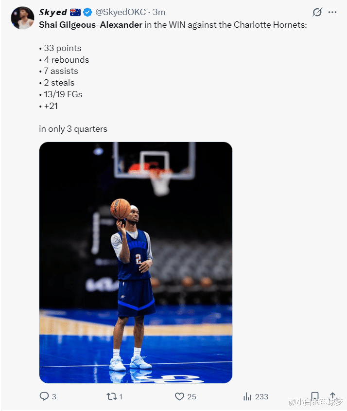 In the third quarter, SGA played for 12 minutes, scoring 15 points, 1 rebound and 1 assist on 6 of 7 three-pointers, 1 of 1 three-pointers, and 2 of 2 free throws. Under his leadership, the Thunder took away the game 32-18 in a single quarter. In 29 minutes of the third quarter, SGA made 13 of 19 shots, 3 of 4 three-pointers, 33 points, 7 assists, 4 rebounds and 2 steals, with a shooting percentage of 68.4%, a three-point shooting percentage of 75%, and a plus-minus value of +21.