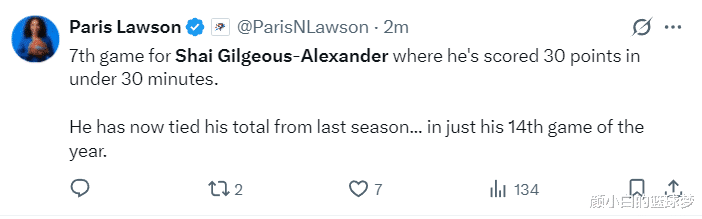Thunder reporter Paris Lawson wrote: This is the seventh time Alexander has scored 30+ points in less than 30 minutes this season. In only 14 games this season, he has tied the number of 30+ games he scored in less than 30 minutes last season. (This shows that SGA is even stronger this season than last season)
