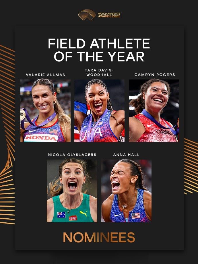 October 21st World Athletics recently announced the list of candidates for the 2025 "World's Best Women's Track and Field Athlete": Allman, Davis, Hall, Oli Slags, and Rogers were selected.