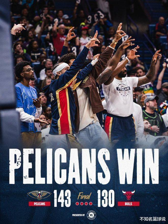 Back from the halftime break, the Pelicans scored 30+ points in three consecutive quarters, while the Bulls scored 30+ points in a single quarter for the second time in this game. The two sides continued to attack. The Pelicans used the team's offensive suppression to gain a 96-78 lead in the middle of the third quarter, and later expanded their lead to 104-82 by 22 points. The Bulls counterattacked to chase points, but the two sides continued to attack with 30+ points in a single quarter in the final quarter. The Pelicans maintained a 131-113 lead of 18 points with 4 minutes and 40 seconds left. The Bulls fought back tenaciously and were unable to recover. In the end, the Pelicans defeated the Bulls 143-130, ending their 9-game losing streak.