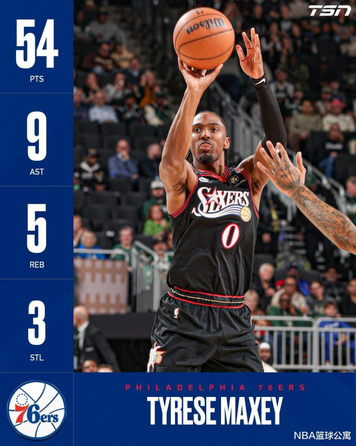 Maxi scored 54+9+6 3-pointers, the second miracle in the NBA, and also broke the record. 76 people captured the Bucks! George 21+5!