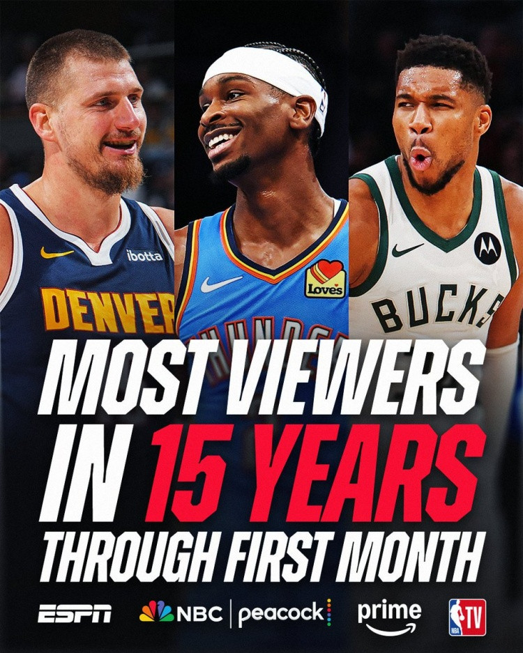 November 21 Today, the NBA officially announced that the national live events broadcast on NBC/Peacock, Amazon PrimeVideo and ESPN platforms in the first month of this season’s regular season have attracted more than 60 million viewers, setting a record for the highest ratings in the opening stage in the past 15 years.