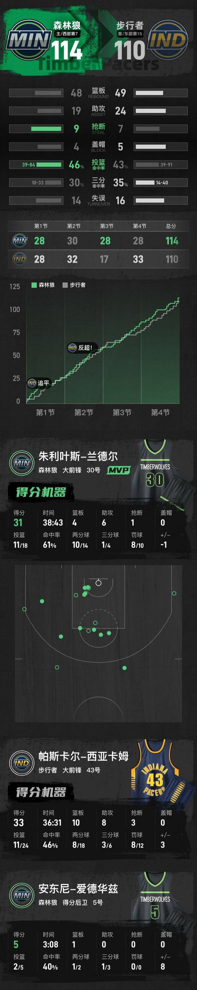 Entering the final quarter, the Timberwolves once again performed well and launched a wave of offense at the beginning, extending the lead to 13 points. Faced with pressure, the Pacers began to counterattack and gradually narrowed the point difference to 4 points. However, the Timberwolves stabilized their state and continued to maintain the offensive rhythm. In the end, they steadily expanded their advantage and reopened the point difference. Siakam performed outstandingly in this quarter, scoring 12 points, including a three-pointer. In the end, the Timberwolves won the game 114-108.