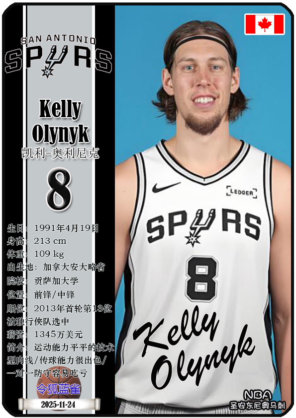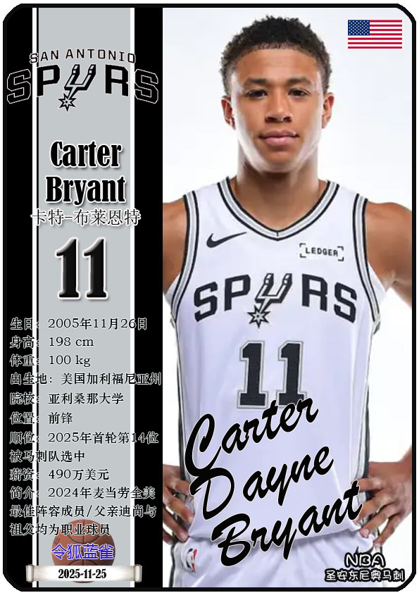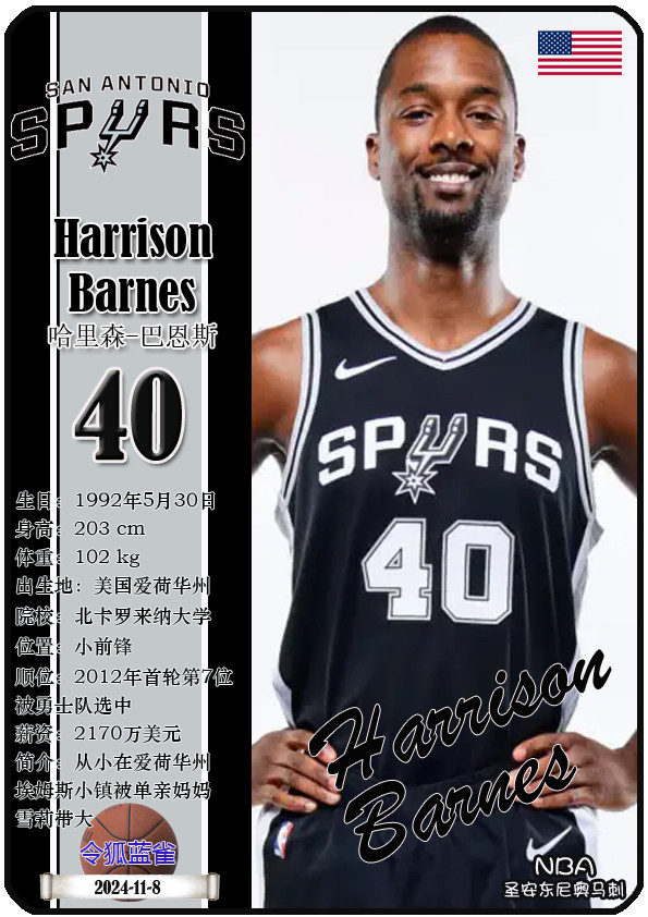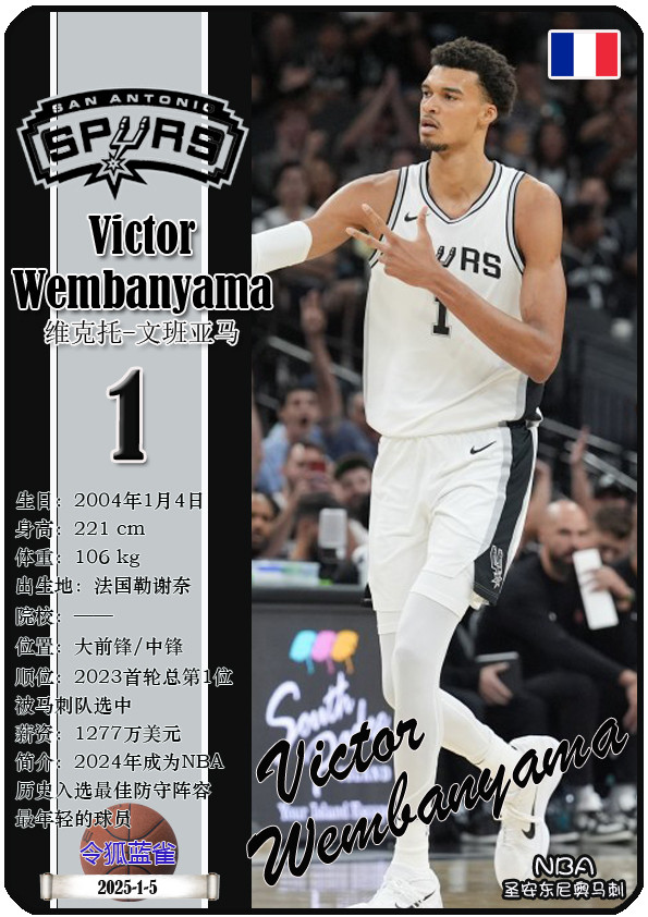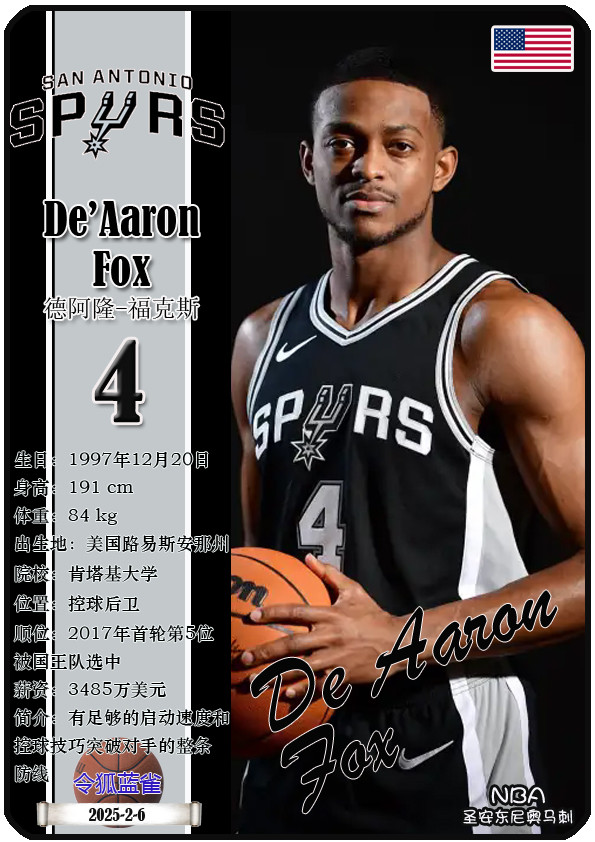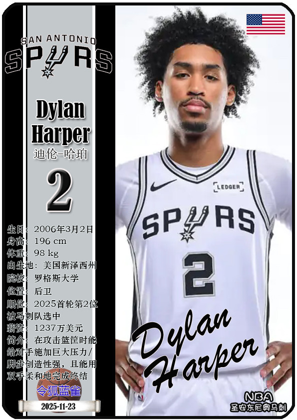 The Dallas Bushes, the predecessor of the NBA San Antonio Spurs, was founded in 1967 and has a history of 58 years. As of November 25, 2025, the team's head coach is Mitch Johnson, and the team has players De'Aaron Fox, Devin Vassell, Harrison Barnes, Victor Vunbanyama, etc. This issue shows the current 18 players of the NBA San Antonio Spurs in the form of star cards (sorted by jersey number):