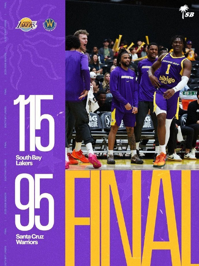 The South Bay Lakers went on a 33-16 offensive in the third quarter, leading 89-66 by 23 points in the first three quarters. In the final quarter, the South Bay Lakers were chased back by 3 points 26-29. In the end, the South Bay Lakers defeated the Santa Cruz Warriors 115-95.