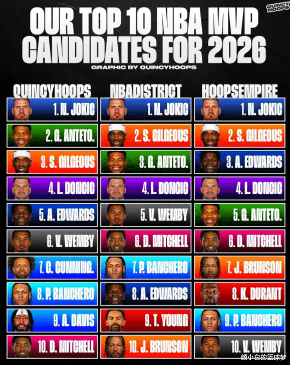 Recently, the US media Quincy Hoops, NBA District, and Hoops Empire selected the top ten regular season MVP list for the 25-26 season. The top ten rankings in the minds of these three American media are quite different. However, LeBron, who is about to turn 41, is no longer included, and there is no one to choose Curry at the age of 37.