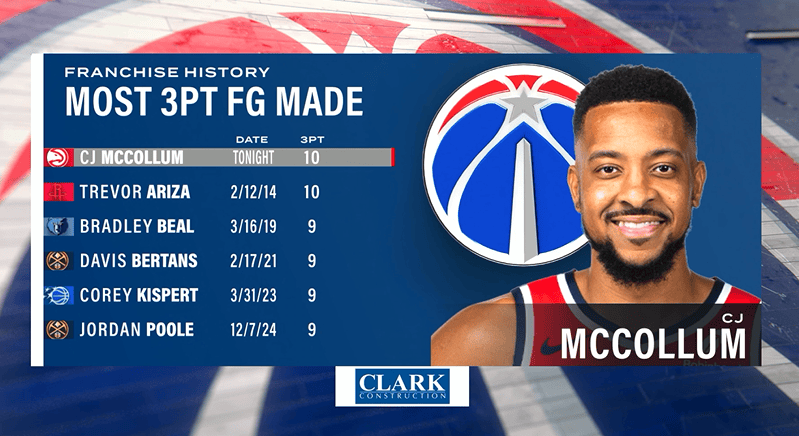 According to US media statistics, McCollum's 10 three-pointers topped the Wizards' single-game three-point list.