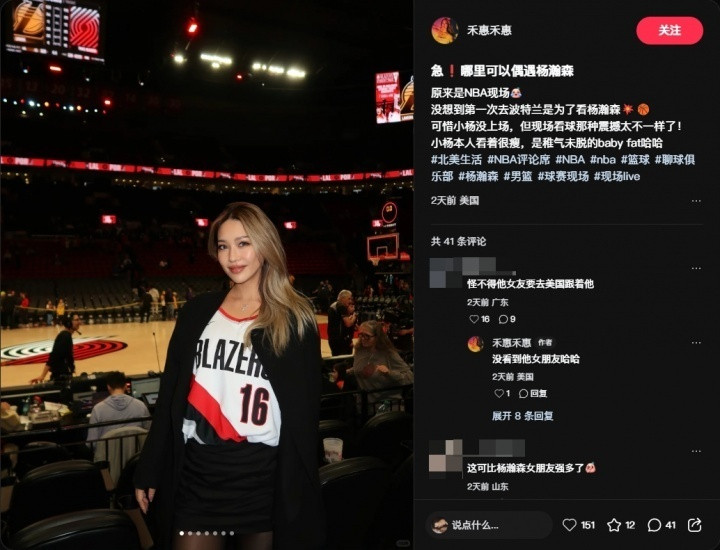 The chaotic situation of the Portland Trail Blazers this season has not only confused local fans, but also made the Chinese fans who came here specially feel complicated. Recently, a beautiful fan with a beautiful face appeared at the Moda Center. She was wearing Yang Hansen's jersey just to cheer for the Chinese teenager. Although she failed to see Yang Hansen play in the end, the text she wrote on social media attracted a lot of attention: "I didn't expect that the first time I went to Portland was to see Yang Hansen. It's a pity that Yang didn't play, but the shock of watching the game live was so different." She also specifically mentioned the close observation of Yang Hansen himself, describing that although Xiao Yang looked very thin, he still had "childish baby fat" on his face. Some fans asked Yang Hansen if his girlfriend was at the scene, and then the blogger replied that he did not see the legendary girlfriend at the scene.