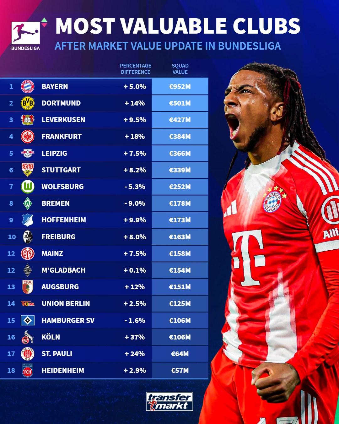 FootballHupu reported on October 14th that the German transfer market updated the latest values of Bundesliga players and took stock of the latest value rankings of Bundesliga clubs. Bayern leads the list with 952 million euros, followed by Dortmund and B...