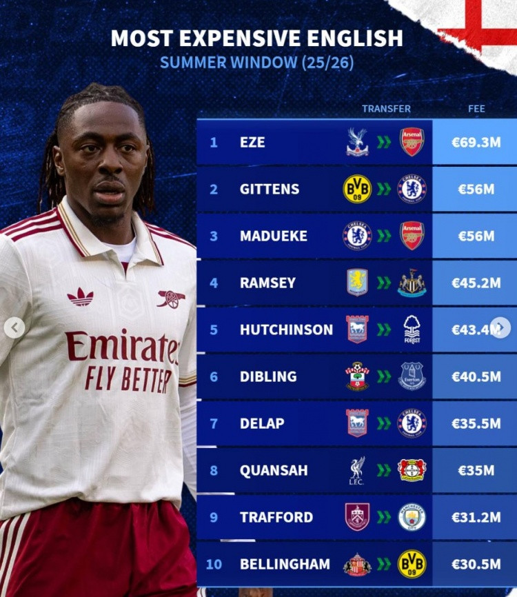 English player transfer fee list this summer: Eze 69.3 million, Gittens and Maduaike ranked second and third