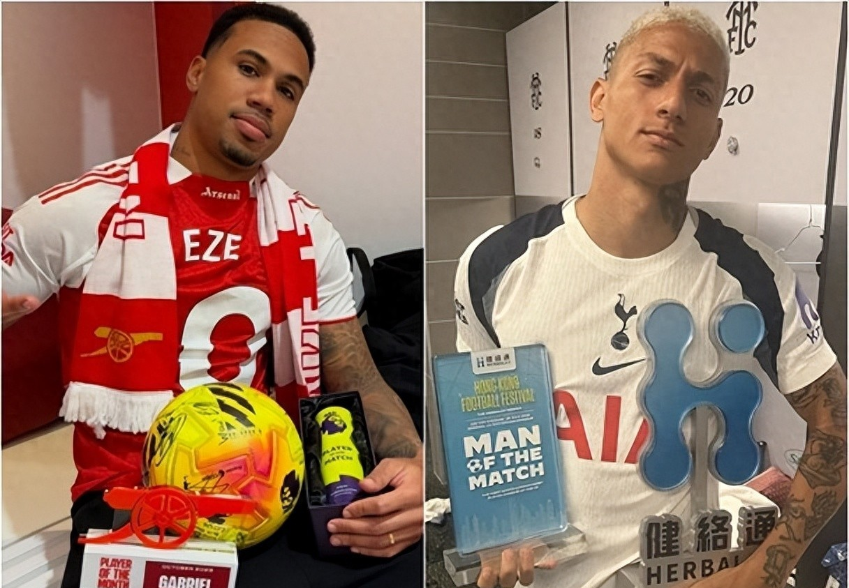 This time Arsenal won a big victory in the North London Derby of the Premier League. Gabriel, who was recovering from injury, also came to watch the game to cheer him up. He received the "Arsenal Player of the Month Award for October" before the game. After the game, he also borrowed Eze's "Best Player Award" and signed ball. He showed off the same actions and "arrogant and proud" expression of Richarlison that day, and "tagged @" in return of Richarlison. These two Brazilian boys really have a revenge!