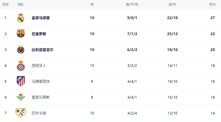 Real Madrid's victory over Barcelona changed the championship landscape. In the standings, Real Madrid has expanded its lead, leading with 27 points and 5 points ahead of second-placed Barcelona, taking the initiative to win the championship. Villarreal ranks third with 20 points. The Spaniard ranked fourth with 18 points. Atletico Madrid has 4 wins, 4 draws and 1 loss, and only scored 16 points, ranking 5th. Real Betis also has 16 points, ranking 6th.