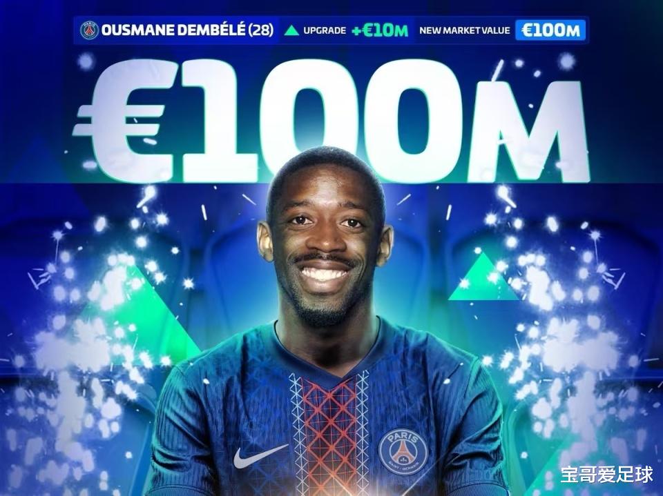 No. 1, Dembele, worth 100 million euros, Paris forward. The 28-year-old Dembele transferred to Paris from Barcelona for 50 million euros in August 2023. He has played 99 times for Paris and contributed 43 goals and 33 assists. His value has increased by 10 million euros in this update, reaching 100 million euros. This is also the second time that Dembele's worth has reached 100 million euros since February 2019, returning to the billion-dollar club in football.
