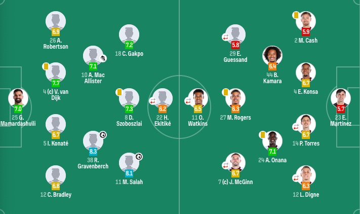 Aston Villa starting: 23-Martinez, 2-Kash, 4-Konsa, 14-Paul Torres (74 '5-Mings), 12-Digne (74 '22-Mattson), 24-Amadou Onana, 44- Boubacar Kamara, 7-McGin (59 '6-Barkley), 29-Gaisan (59 '17-Mullen), 27-Rogers, 11-Watkins (74 '19-Sancho)
