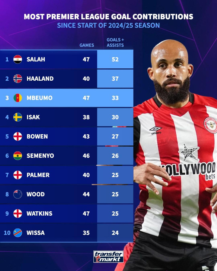 morePremier League players scoring list since last season: Salah, Haaland and Mbemo are the top three