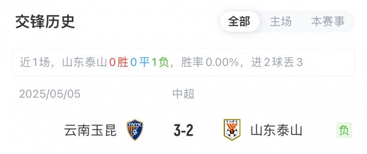 Football10th, the team has lost 3 losses and 2 draws for five consecutive rounds. In the first round of the two sides this season, Taishan was reversed by Yukun. [History of Confrontation between the two sides]...