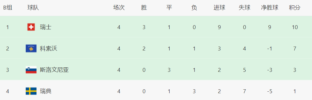 Switzerland ranks first with 10 points, and the promotion situation is relatively optimistic. Kosovo, the dark horse ranked 91st in the world, scored 7 points, closely chasing Switzerland, ranking second. Kosovo beat Sweden twice, which was unexpected. Slovenia ranks 3rd with 3 points. Sweden only scored 1 point and ranked at the bottom.