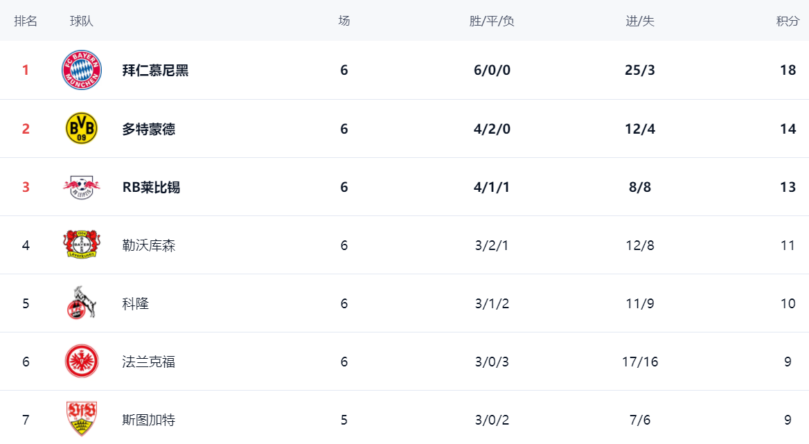 In the standings, Bayern won all six games and ranked first with 18 points, making it the only one. Dortmund, who lost 2 points in this round, ranked second with 14 points. Leipzig has 13 points, ranking third. Leverkusen scored 3 wins, 2 draws and 1 loss, scoring 11 points, ranking fourth. Cologne ranked 5th with 10 points. Frankfurt and Stuttgart both scored 9 points, ranking 6th and 7th.