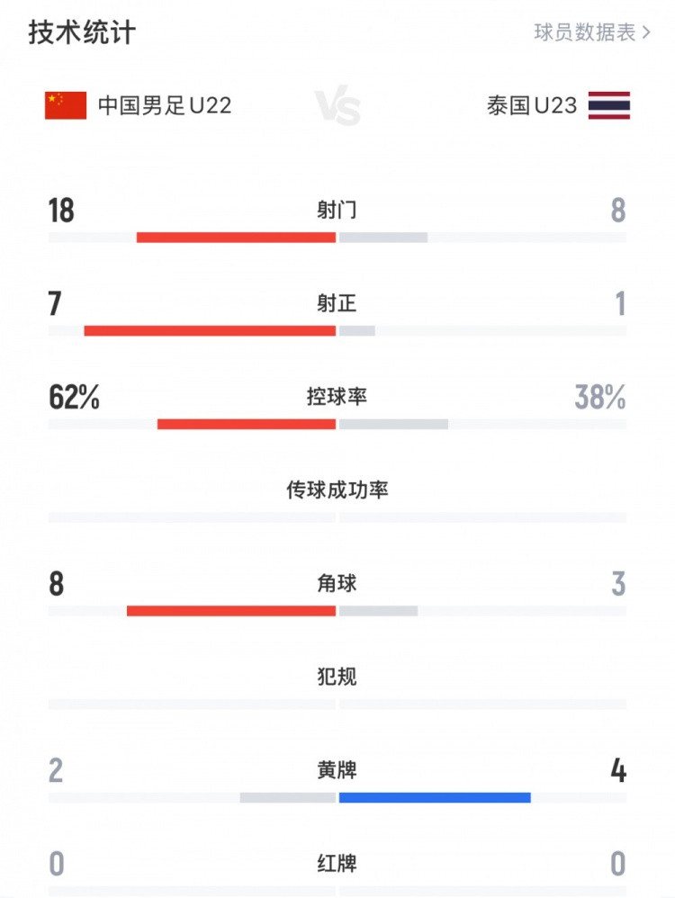 In the previous first match between the two teams, the Chinese U22 men’s football team defeated the Thai team 3-1. The two teams met again yesterday. The Chinese U22 men's football team did not send all the main players. Wang Yudong and Kuai Jiwen both sat on the bench. In the first half of the game, Liu Chengyu's header hit the opponent's goal post, but unfortunately he failed to score. In the second half, the Chinese U22 men's football team replaced nine players at once, including Wang Yudong, Kuai Jiwen, Li Xinxiang, Baihe Lamu and other main players. In the whole game, the Chinese U22 men's football team took 18 shots and had a ball possession rate of 62%, but they were never able to convert their advantage into goals.