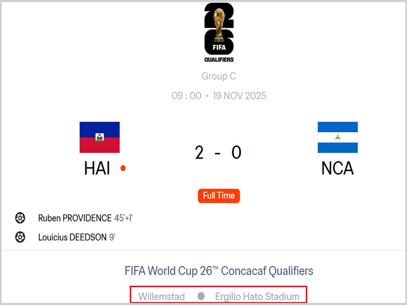 It turns out that, as we all know, the situation in Haiti is very bad and safety cannot be guaranteed. Therefore, all of Haiti's World Cup qualifiers are scheduled to be played in other countries. In the previous group stage, since Haiti and Curacao were in the same group, Haiti's home game was arranged in Barbados. In the final group stage, Curacao was used as the home court.